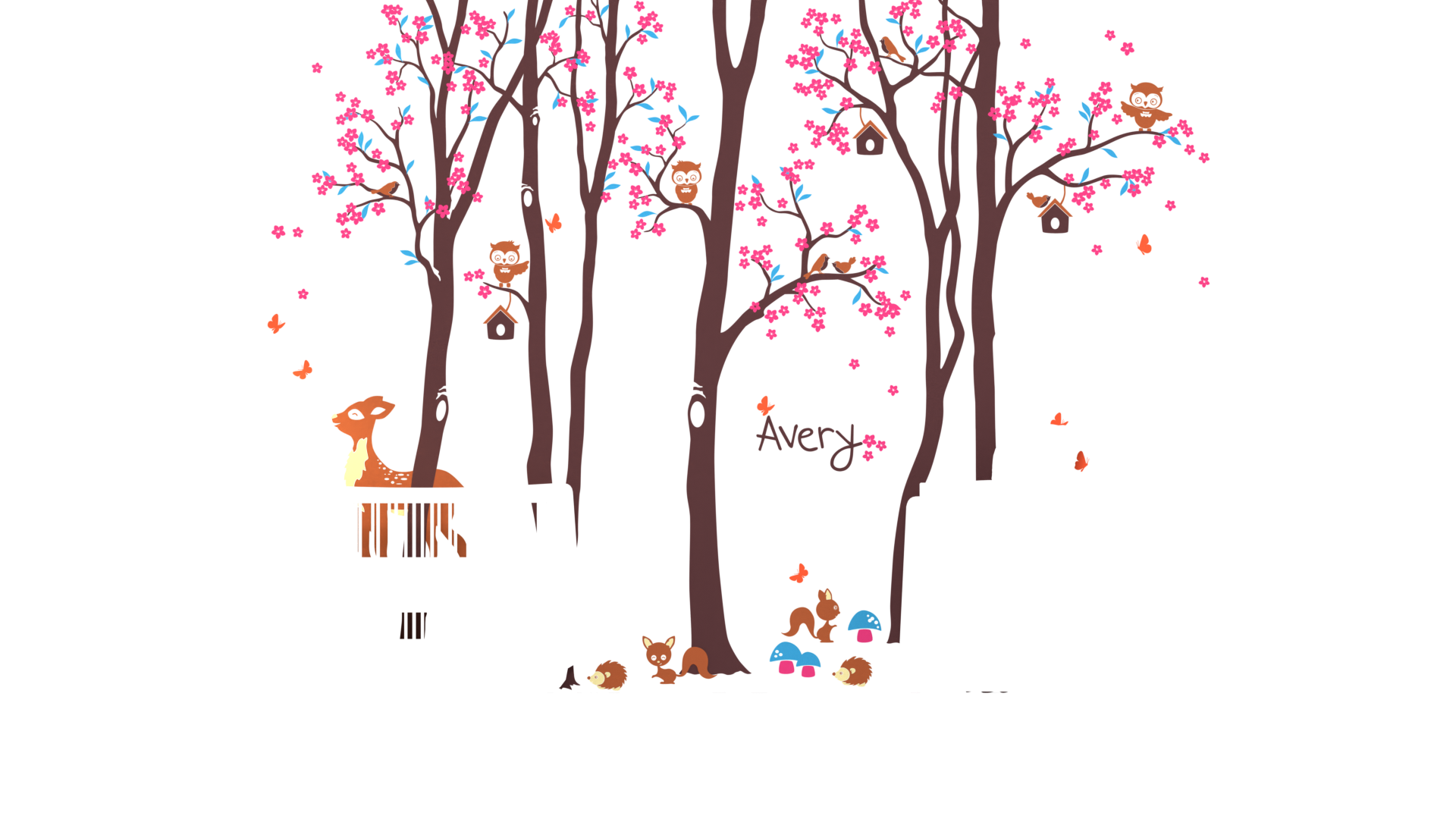 A truly large woodland scene with five trees and lots of woodland animals. There are deer, hedgehogs, owls, birds and squirrels. This decal would fit best in a large room or on several walls if in a smaller room. It would look stunning in any room but is designed for a child's room or nursery. Here it simply looks gorgeous. You can add your child's name to the scene.