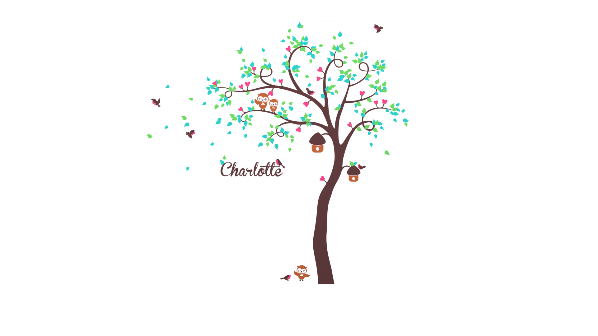This elegant curvy tree is designed as an autumnal tree with falling leaves. It is another simple design which incorporates both small birds, birdhouses and owls. The tree is suitable for a child's room or nursery with a name incorporated into the design. The sticker would look good on a wall around a child's bed or cot with some of the animals appearing to be resting on the cot or bed. Some of the leaves could blow around any furniture in the room.